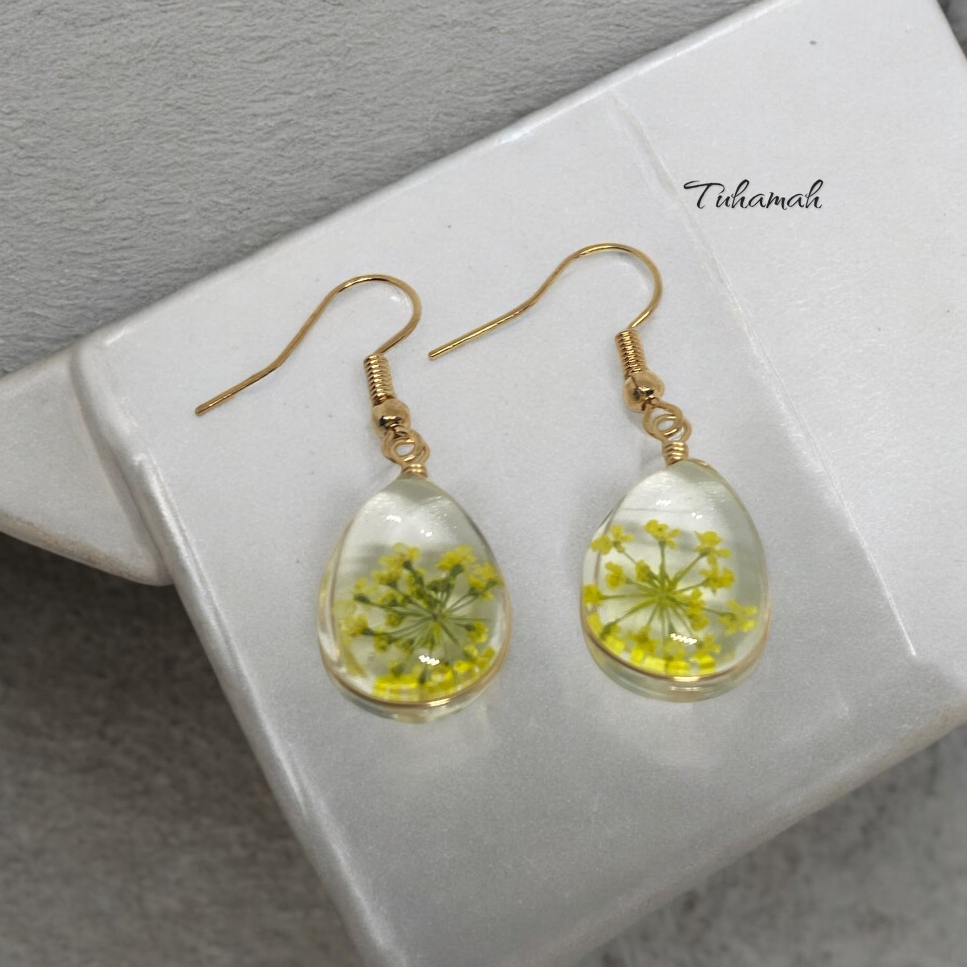 Elegant earrings featuring a floral design encased in a transparent frame, adding a touch of nature and beauty to your look. Crafted with high precision, making them perfect for special occasions and everyday wear. These earrings reflect the beauty of nature in an elegant and unique design.
