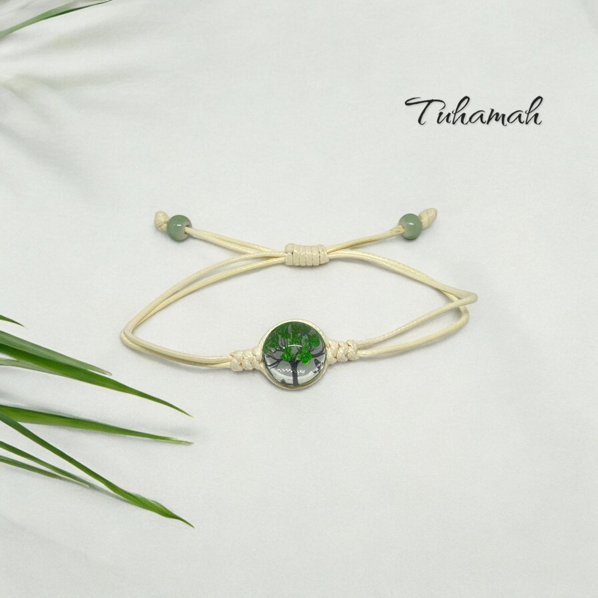This bracelet features a simple and elegant design. It has a double cord that enhances its durability and beauty. At the center, there's a circle with an attractive tree design. The adjustable knot makes it suitable for various wrist sizes. Perfect for daily wear and special occasions. Its design combines elegance and simplicity, making it a unique addition to any accessory collection.