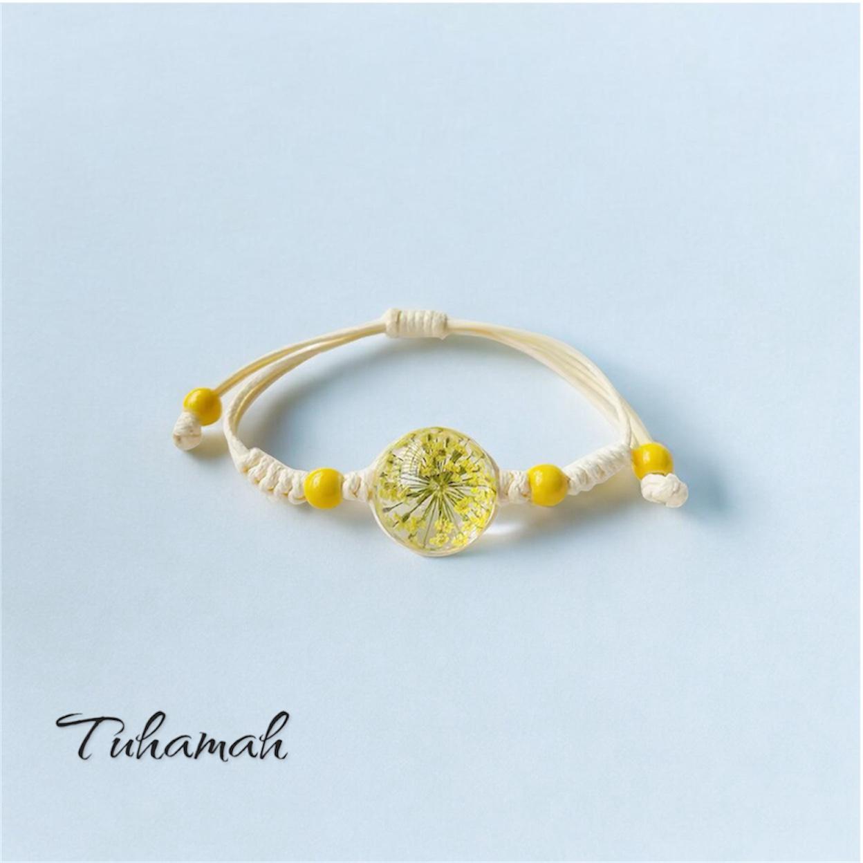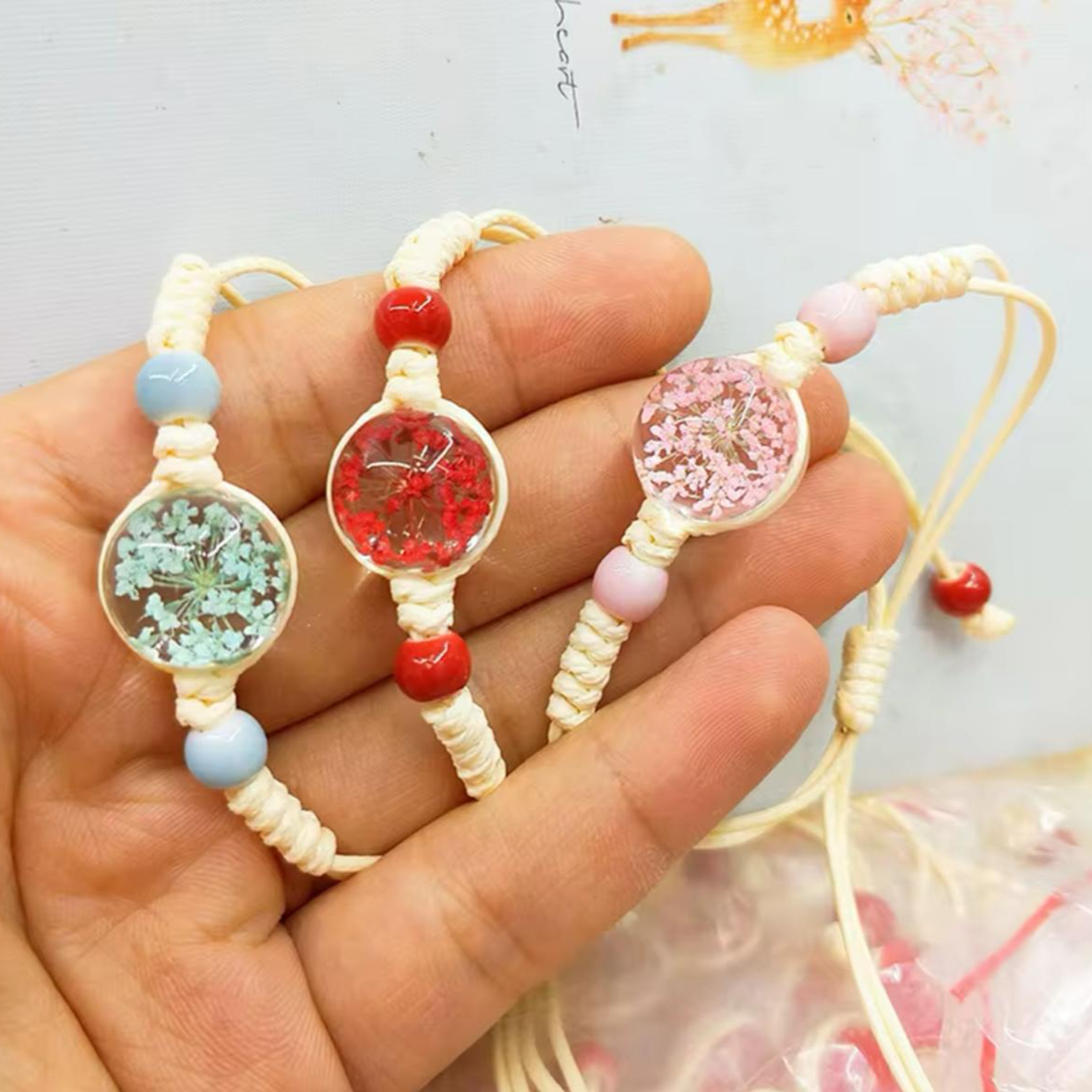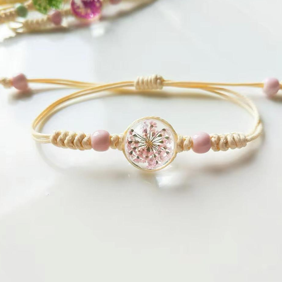 Handmade Natural Dry Flower Bracelet for Women Girls Crystal Baby's-breath Blossom Gemstone Glass Cover Charms Adjustable Rope Strand Bangle Bracelet lovers' Best Friend Gift Jewelry